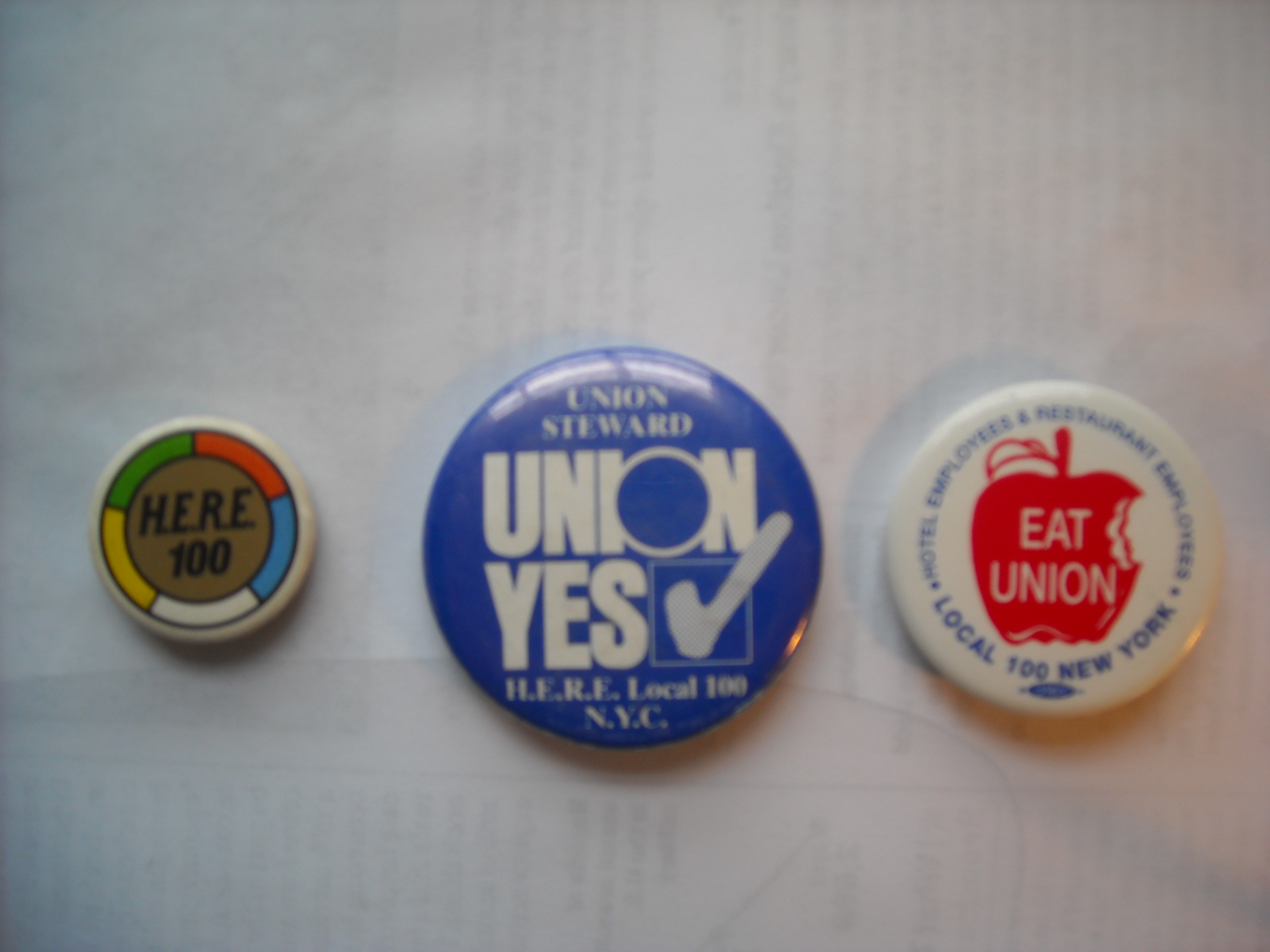 My union buttons from NYC, with my Shop Steward button in the center, that which caused me nothing but grief from the restaurant management but which I wore proudly and in defiance of their anti-union actions toward the staff.