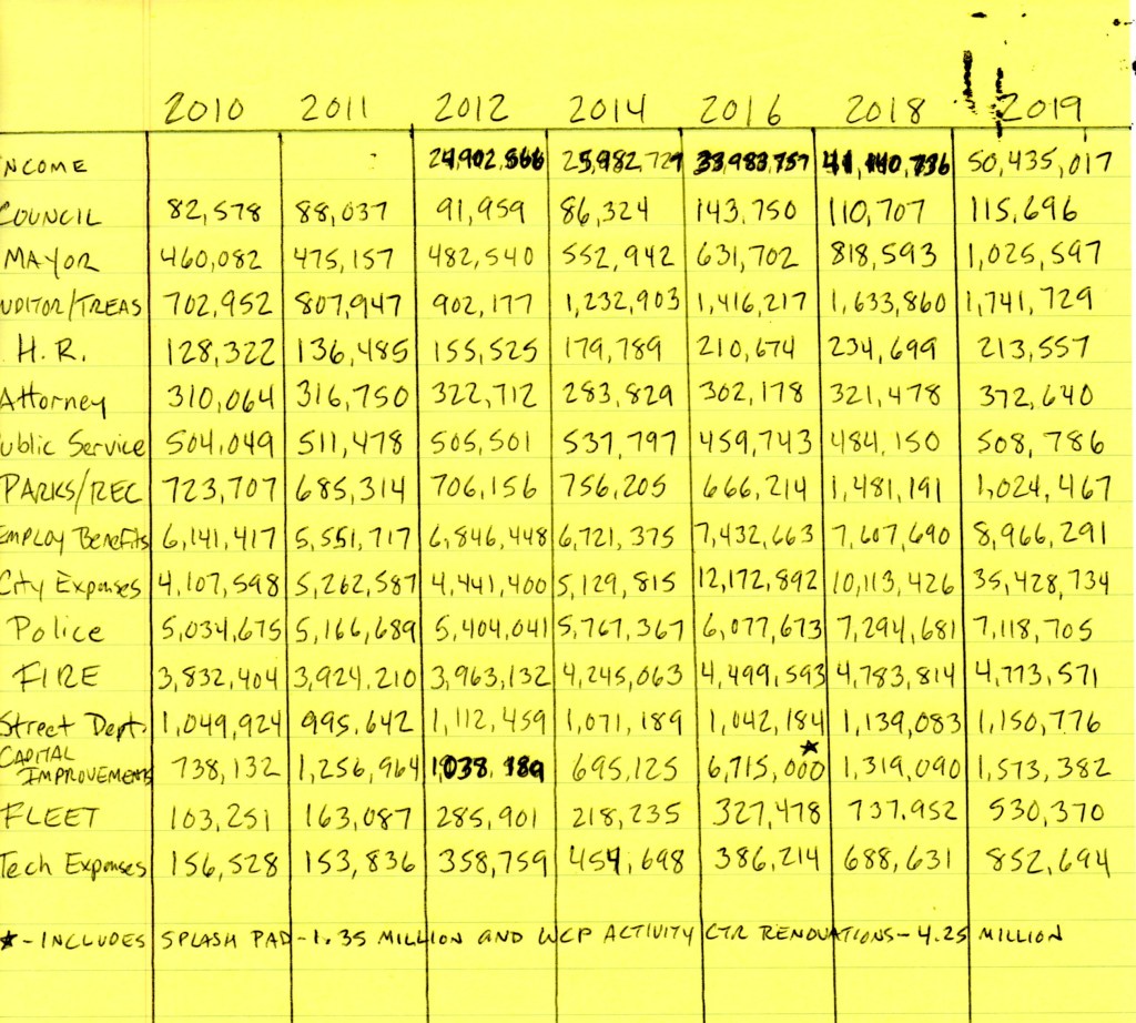 Here are a number of documents showing various figures related to Whitehall City Hall’s spending. I thought the citizens would find them interesting, particularly in light of them wanting to attach a surcharge to taxpayer’s utility bills to pay for water/sewer lines.